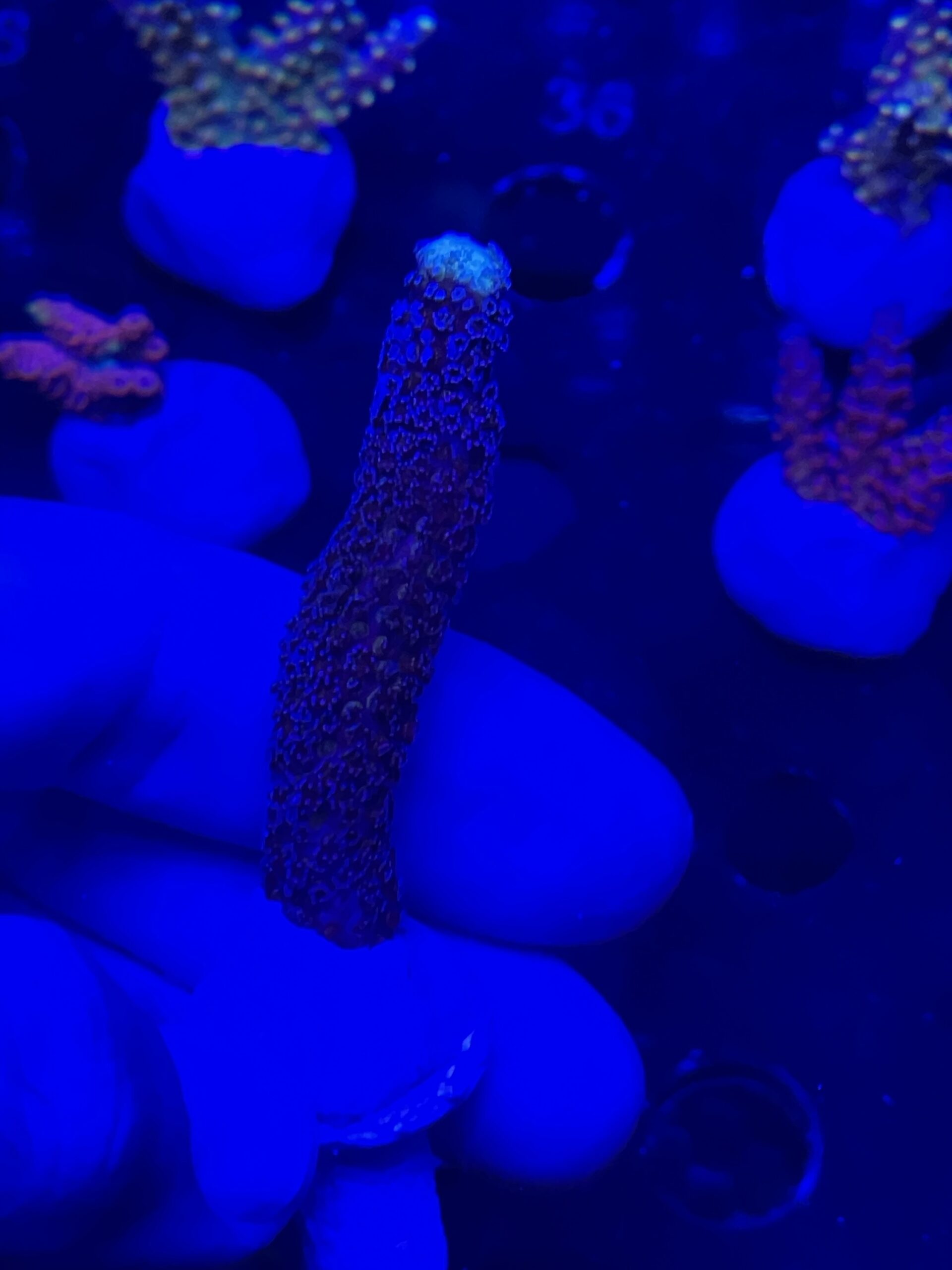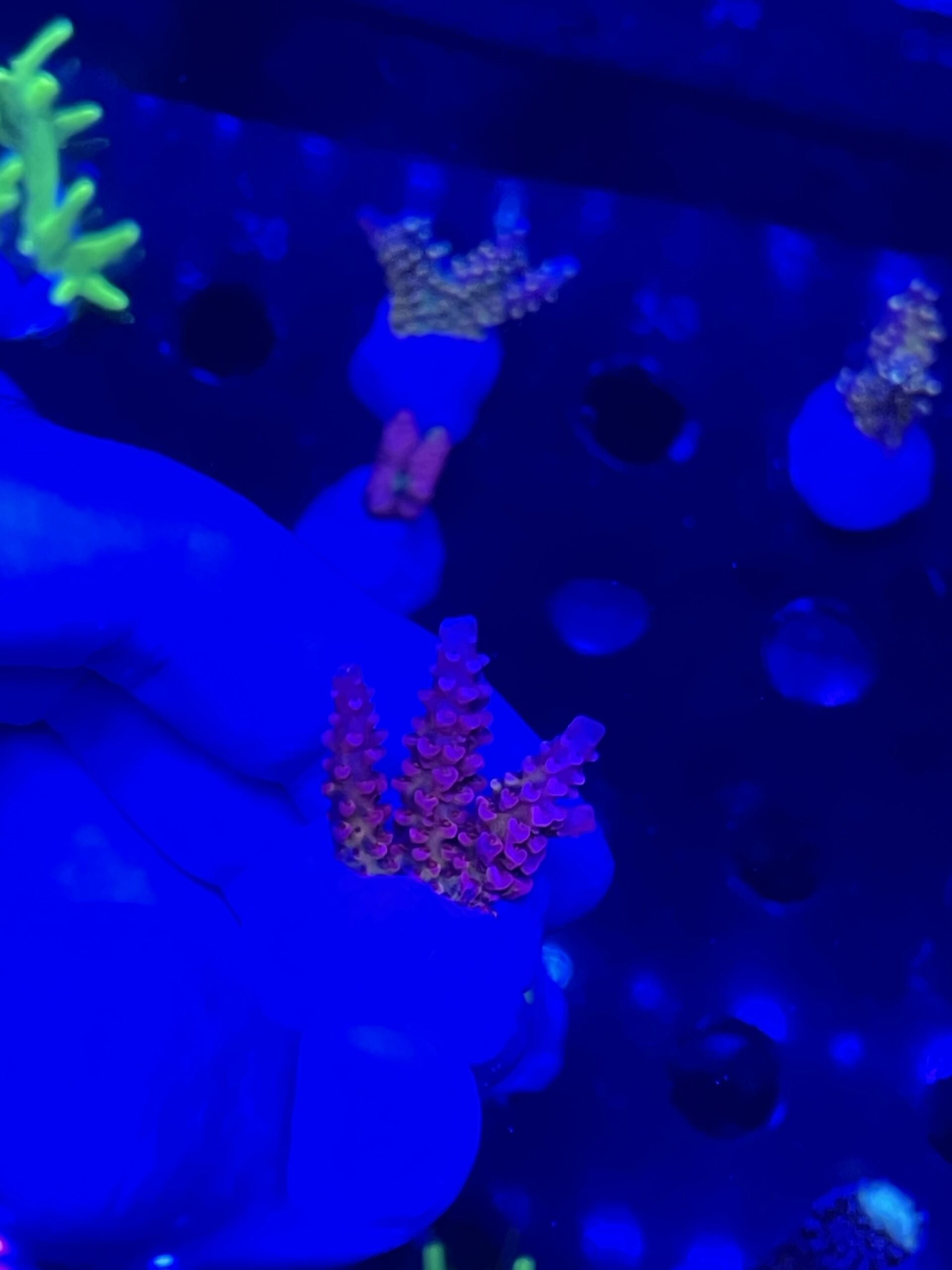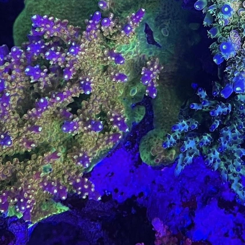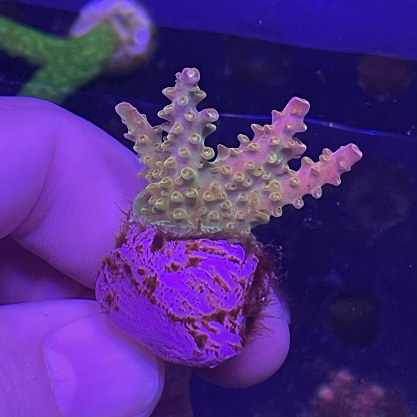 This is one of my favorite. It has green base and pink to magenta coralites.